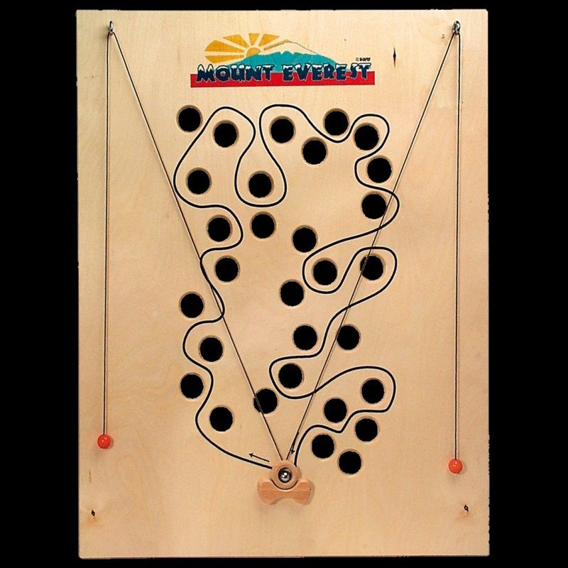 Guidez la bille sur le parcours à l'aide des ficelles attachées à vos genoux.