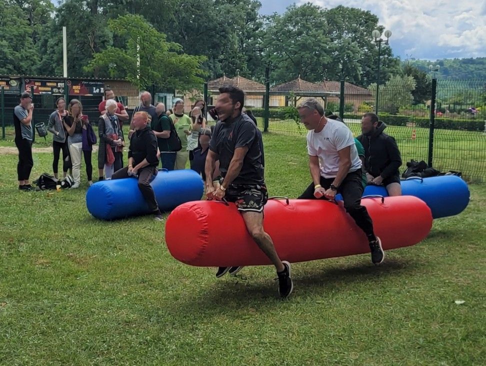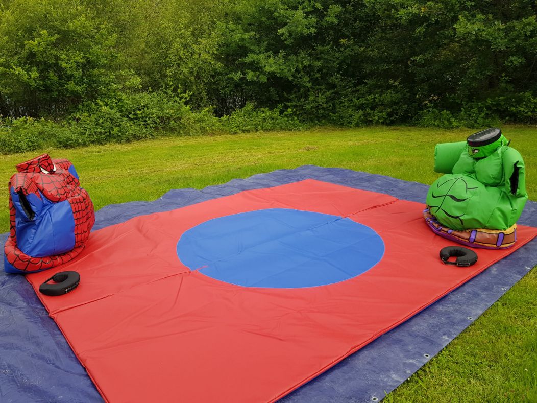 Un concurrent de chaque équipe enfile son costume et au top départ, ils essaient de faire tomber leur adversaire.