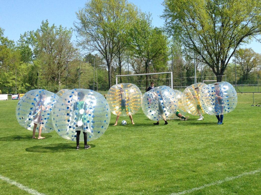 Dans un de nos terrains de foot gonflables ou sur un terrain libre, deux équipes jouent un match de foot original.