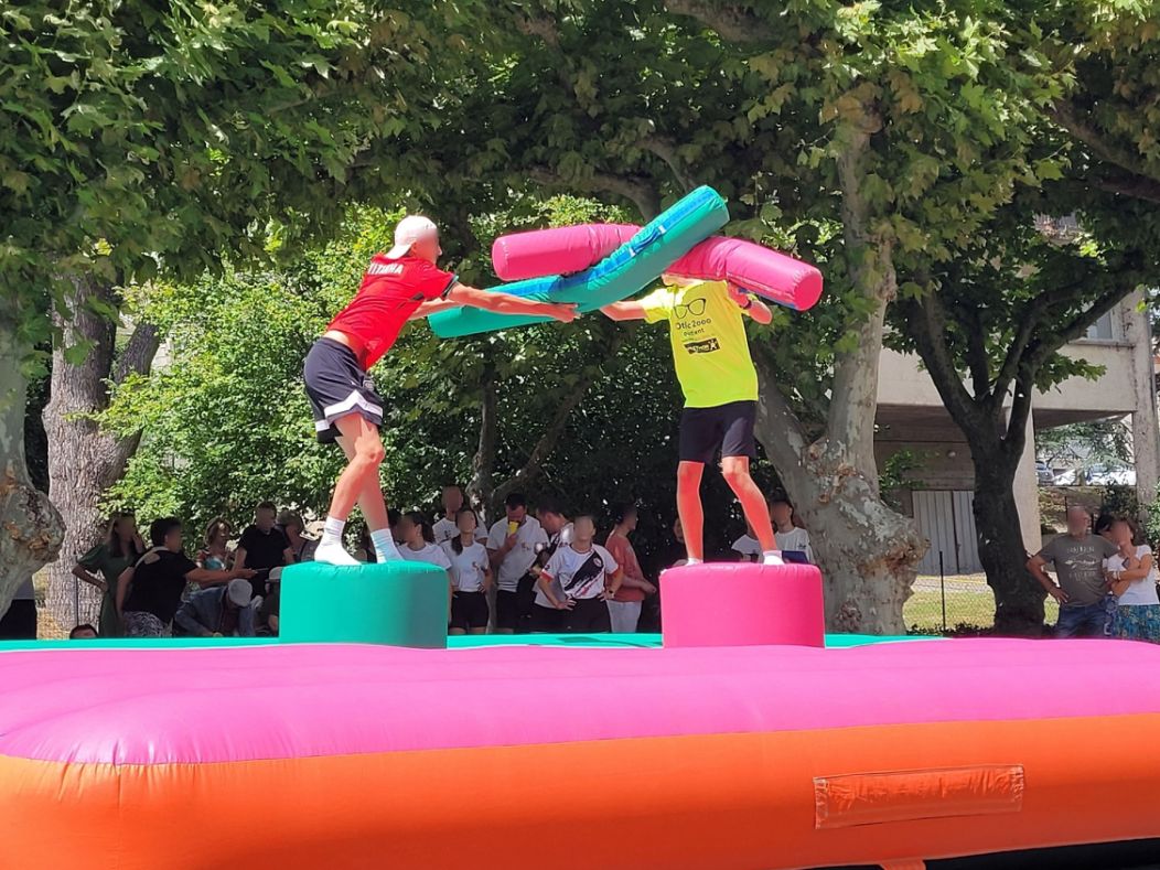 Les participants montent sur leurs plots et doivent faire tomber leur adversaire à l'aide de leur barre en mousse.