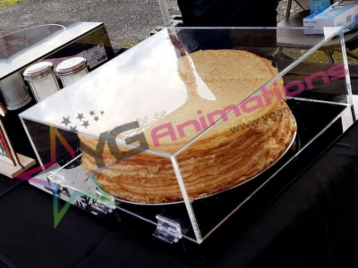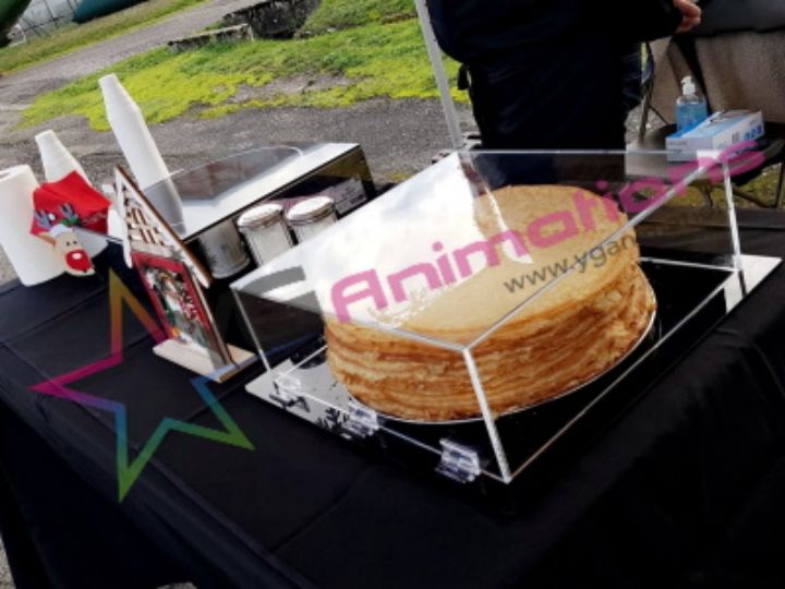 Location du bar à crêpes avec prestation sur site. Le personnel est en charge de l'installation, du fonctionnement de la machine et du service. La table et le nappage ainsi que la garniture sont inclus dans cette formule.