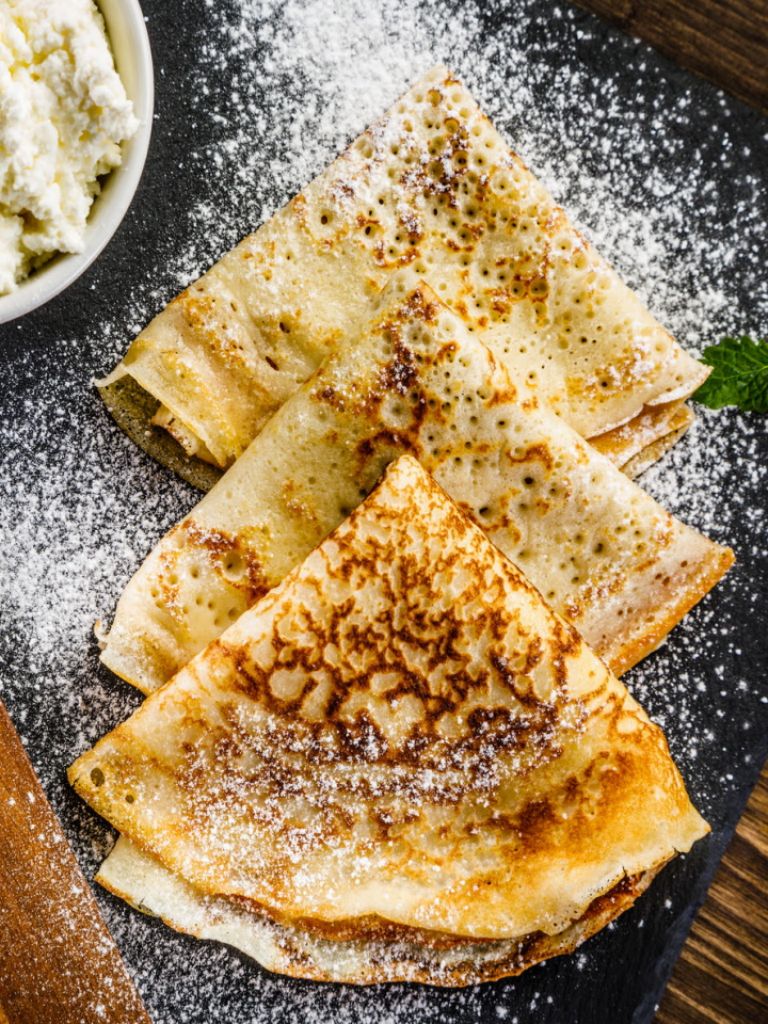 Les crêpes sont servies avec du sucre glace ou de la sauce chocolat.