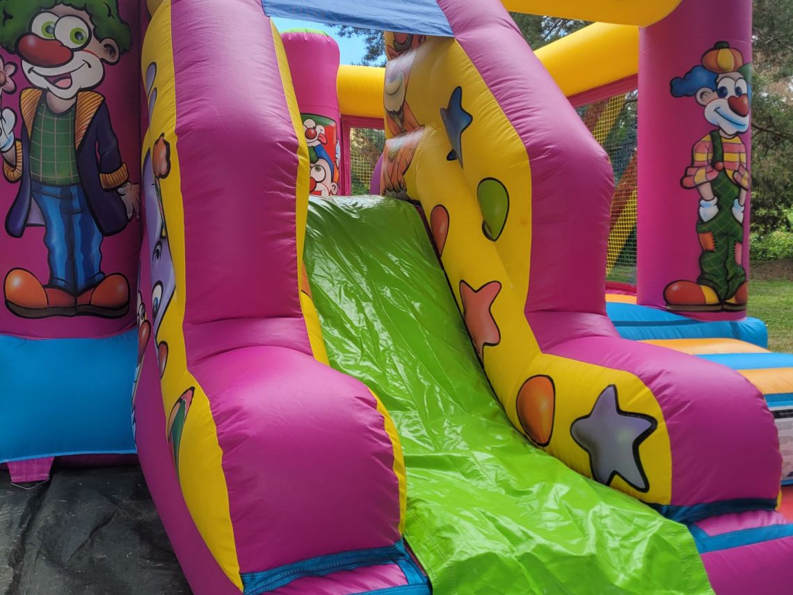 Le château gonflable enfants Le Clown est un combiné de château gonflable à sauter et d'un petit toboggan. Deux obstacles sont présents à l'intérieur.
