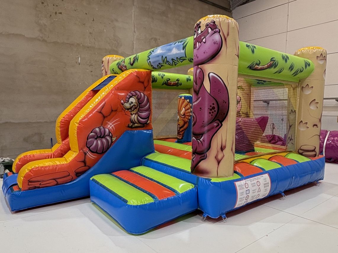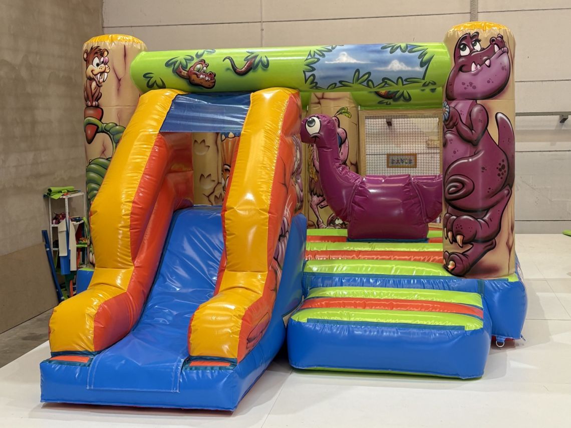 Le château gonflable enfants Le Dino est un combiné de château gonflable à sauter et d'un petit toboggan. Deux obstacles sont présents à l'intérieur dont un dinosaure sur lequel les enfants pourront monter.