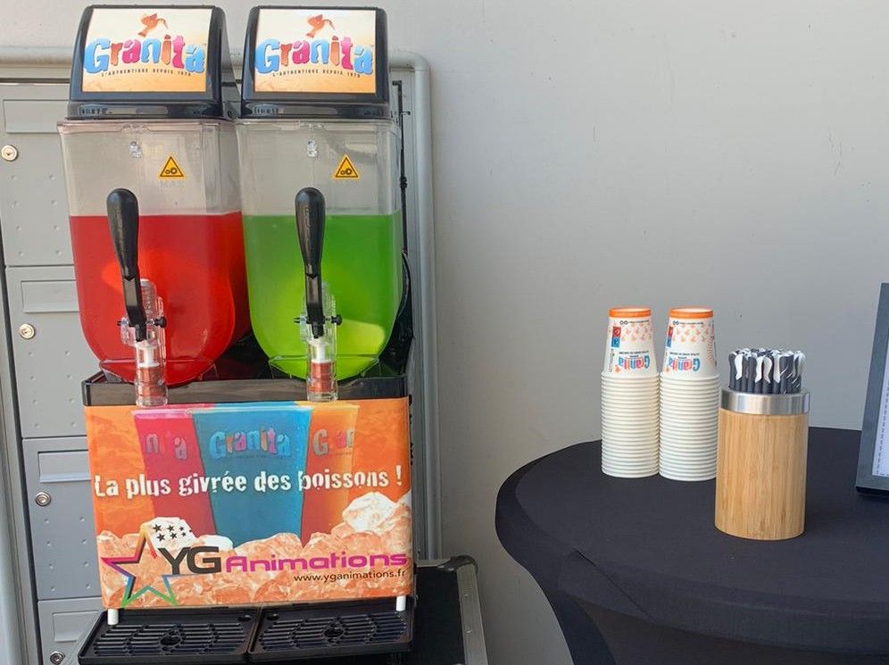 Stand granitas avec prestation sur site. Le personnel est en charge de l'installation, du fonctionnement de la machine et du service.