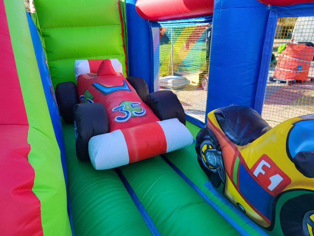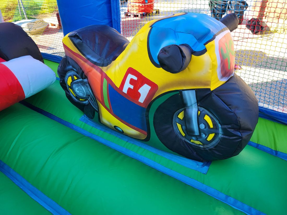 La structure gonflable Le Grand Prix est un combiné d'une espace de jeux à sauter et d'un toboggan. Deux obstacles sont présents à l'intérieur du jeu: une moto et une voiture de course sur lesquels les enfants pourront monter.