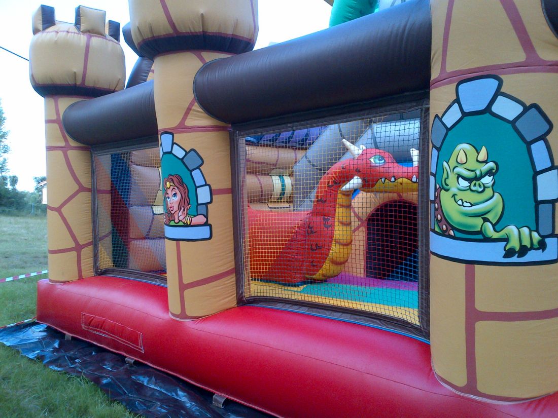 La structure gonflable Le Médiéval est le plus grand de nos jeux combinés. Il est composé d'un espace de jeux à sauter et d'un toboggan avec un tunnel dessous. Quatre obstacles sont présents à l'intérieur du jeu dont deux grands dragons sur lesquels les enfants pourront monter.