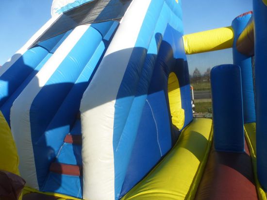 La structure gonflable Le Pirate est un combiné d'un espace de jeux à sauter et d'un toboggan avec un tunnel dessous. Quatre obstacles sont présents à l'intérieur du jeu.