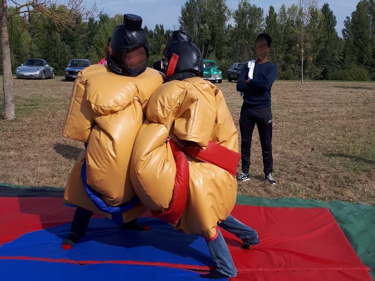 Un concurrent de chaque équipe enfile son costume et au top départ, ils essaient de faire tomber leur adversaire.