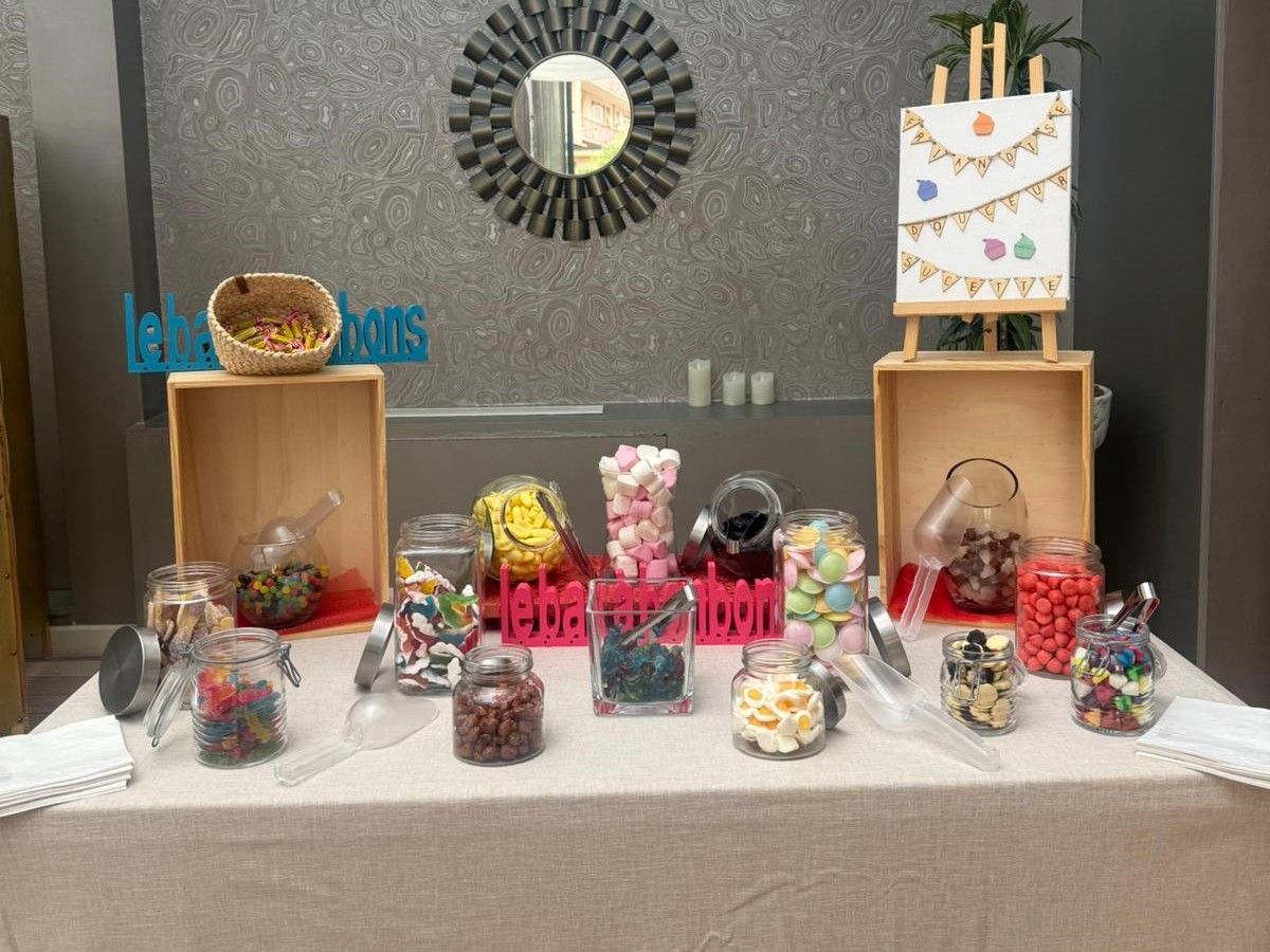 Bar à bonbons avec prestation sur site. Le personnel est en charge de l'installation, du fonctionnement du stand et du service.