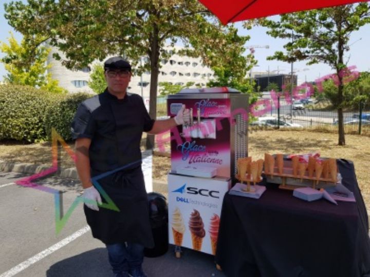 Location de la machine à glaces à l'italienne avec prestation sur site. Le personnel est en charge de l'installation, du fonctionnement de la machine et du service. La table et le nappage sont inclus dans cette formule.