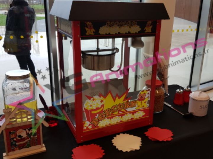 Location de la machine à pop corn avec prestation sur site. Le personnel est en charge de l'installation, du fonctionnement de la machine et du service. La table et le nappage, l'huile de tournesol, le sucre sont inclus dans cette formule.