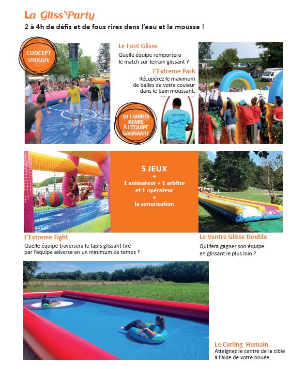 - 5 jeux gonflables de compétition: Le Foot Glisse, L'Extreme Park, L'Extreme Fight, Le Ventre Glisse Double, Le Curling Humain