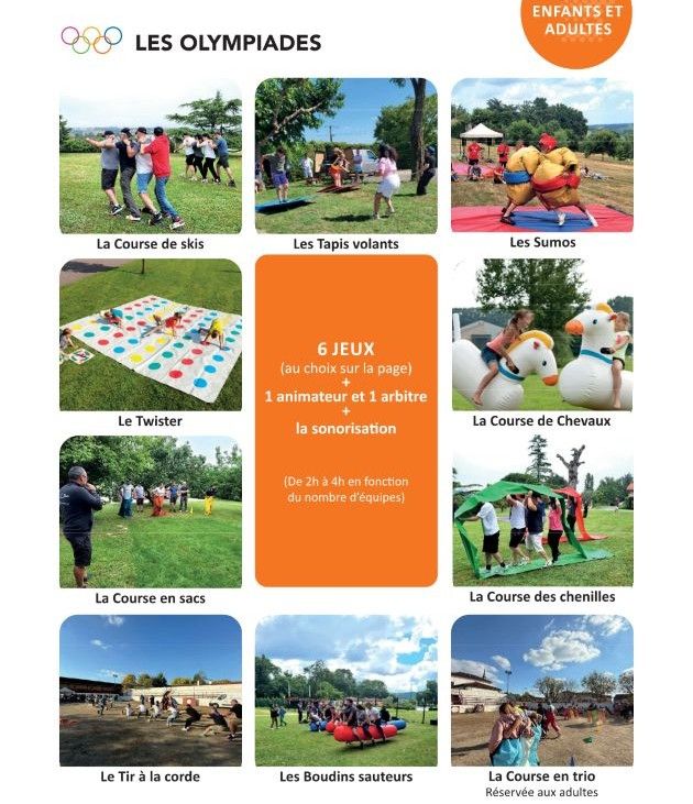 Nous vous proposons différents packs Olympiades Intervillages correspondant à différents budgets. Ces packs Olympiades Intervillages pourront également être adaptés à vos besoins.