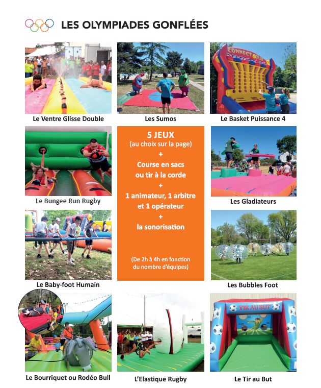 - 5 jeux gonflables de compétition au choix dans la liste suivante: Le Bourriquet, Les Sumos, L'Élastique Rugby, Le Baby-foot humain, Le Ventre Glisse Double, Les Gladiateurs, Le Rodéo Bull, Les Bubbles Foot, Le Tir au but, Le Bungee Run Rugby, Le Basket Puissance 4