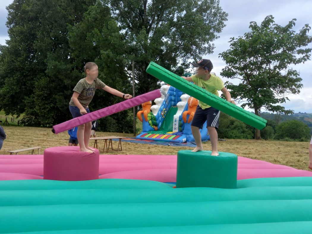Les participants montent sur leurs plots et doivent faire tomber leur adversaire à l'aide de leur barre en mousse.