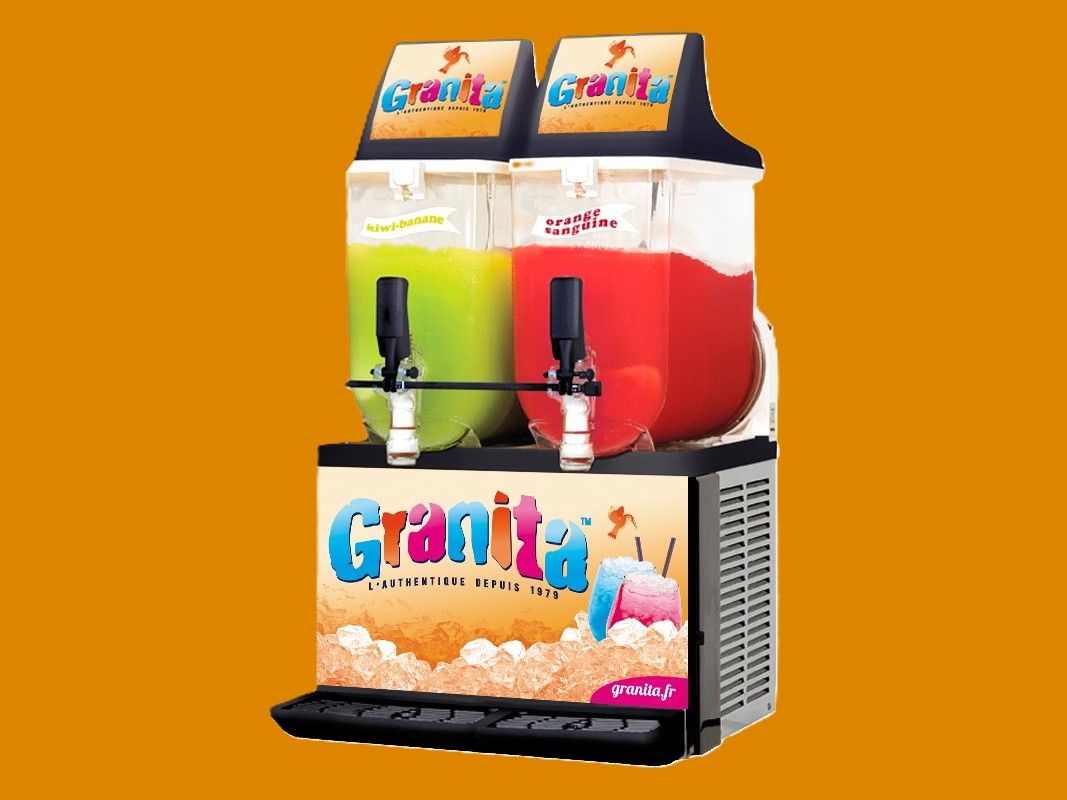 Location du stand gourmand Machine à Granitas 2 bacs avec le consommable (pailles, gobelets et boisson en poudre aromatisée) pour 100 gobelets de 20cl.